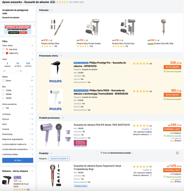 Przykładowe wyniki wyszukiwania na Ceneo – kupujący zwraca uwagę głównie na cenę, opinię innych klientów, zdjęcie produktu, darmową i szybką wysyłkę. Oferty promowane mogą być wyświetlane wyżej, nawet jeśli mają wyższe ceny.