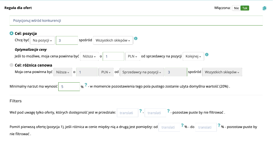Przykład konfiguracji reguły automatycznej zmiany cen w Szpiegomat.pl