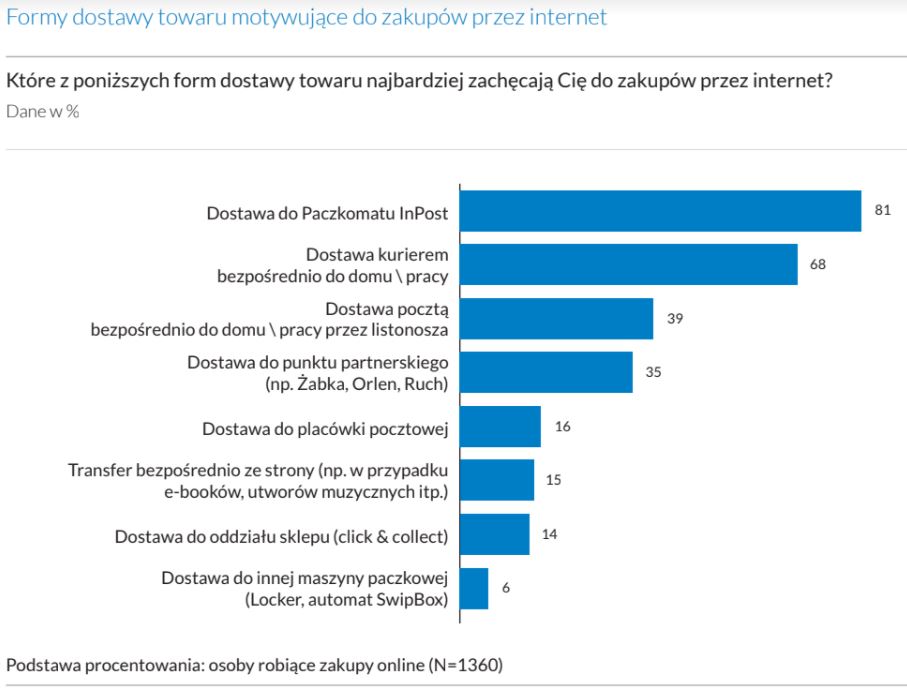 Jak wynika z raportu Gemius „E-commerce w Polsce 2021”, klienci cenią sobie zróżnicowane formy dostawy. Pomimo faktu, że na liście znajdziemy zdecydowanego lidera popularności (dostawa do Paczkomatu InPost), nie możemy zignorować pozostałych metod na dostarczenie zakupów. Każdy klient ma własne, indywidualne potrzeby, którym sprzedawca powinien sprostać. Przykładowo odbiór z Paczkomatu jest problematyczny dla z ograniczonymi możliwościami poruszania się. Z kolei dostawa kurierem wymaga pewności, że w momencie dostawy towaru będziemy pod wskazanym adresem, co nie zawsze jest łatwe do przewidzenia. Sprzedawcy powinno zależeć na udostępnieniu jak najszerszego wachlarza opcji dostaw, aby to sam klient zdecydował, które rozwiązanie sprawdzi się w jego przypadku najlepiej.