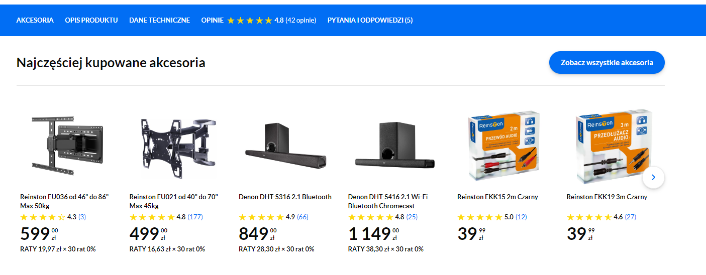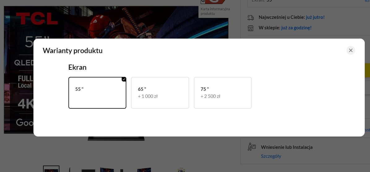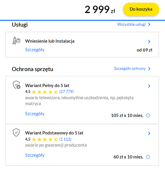 Warto również zwrócić uwagę na sprawnie zrealizowany upselling produktu. Przy wybranym modelu telewizora strona oferuje możliwość wyboru wersji z większymi ekranami za dodatkową opłatą, co jest dostępne jednym kliknięciem.
