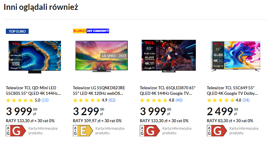 Przewijając stronę jeszcze niżej, natrafiamy na kolejną interesującą sekcję – rekomendacje produktów, które przeglądali inni klienci, również zainteresowani zakupem telewizorów. To dobry przykład wykorzystania danych o zachowaniach użytkowników do stworzenia spersonalizowanych sugestii, które mogą zachęcić do dalszych zakupów.