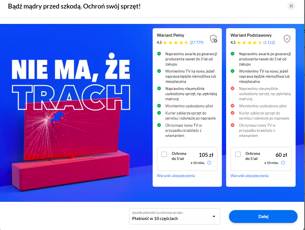 Kiedy już dodamy produkt do koszyka zakupowego, pojawia się ekran, w którym ponownie oferowana jest usługa gwarancji, tym razem z wyszczególnionymi korzyściami i ceną.