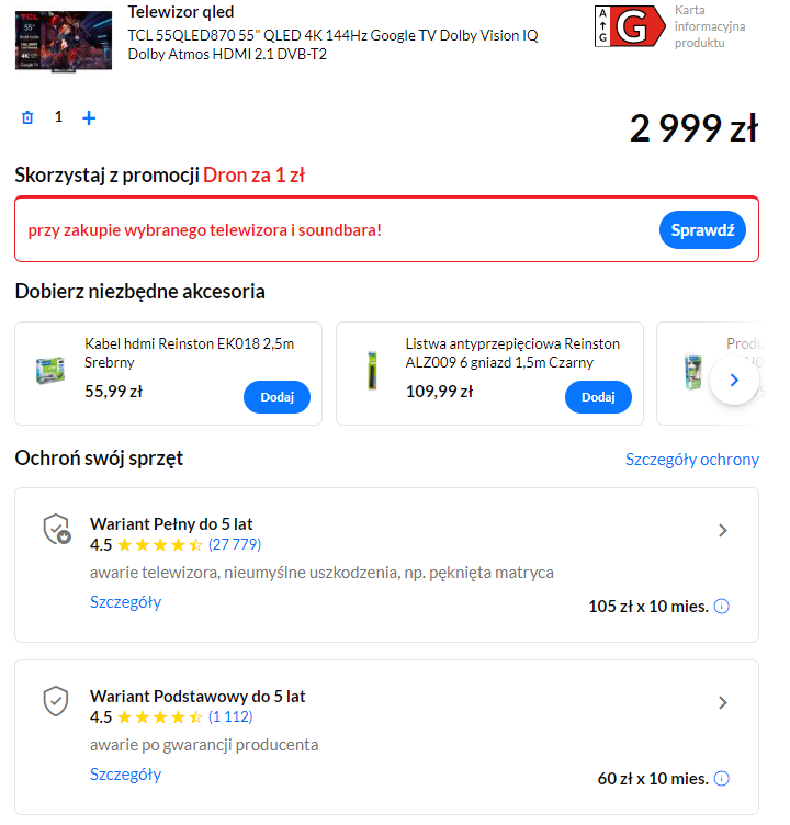 Po kliknięciu przycisku „dalej”, klient trafia na kolejny ekran, który ma za zadanie zachęcić do zwiększenia wartości koszyka zakupowego. Szczególną uwagę przyciąga promocja, w której dron oferowany jest za symboliczną złotówkę. Taka oferta doskonale wpisuje się w koncepcję traffic builderów. Dron, będący produktem atrakcyjnym cenowo, przyciąga klientów, którzy, aby skorzystać z promocji, muszą dokonać zakupu telewizora i soundbara z określonej puli produktów. Te dodatkowe urządzenia, objęte promocją, najprawdopodobniej charakteryzują się wysokimi marżami, co zwiększa rentowność całej transakcji.