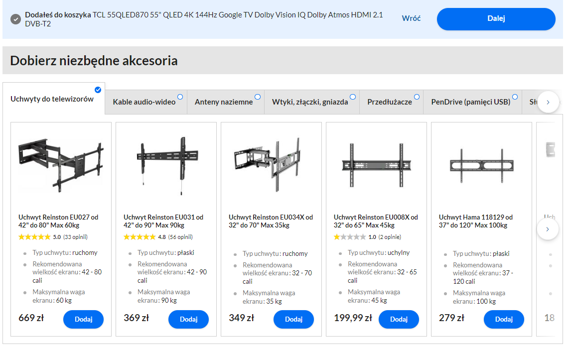 Po dodaniu produktu pojawia się natomiast kolejna rekomendacja artykułów dodatkowych. Zauważ, że te produkty zostały starannie podzielone na różne kategorie, takie jak uchwyty, kable oraz wtyki i złącza. Taki podział nie tylko ułatwia klientom nawigację i pozwala na szybsze znalezienie potrzebnych akcesoriów, ale również zwiększa możliwości wyboru.